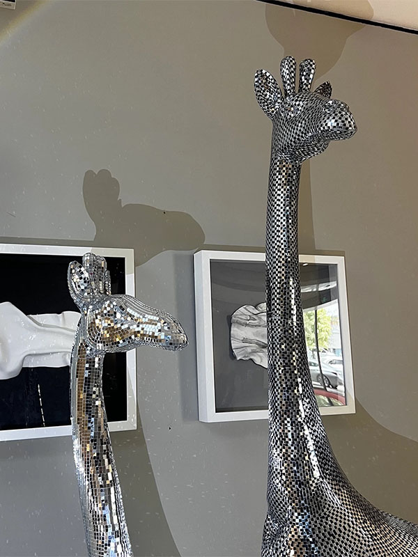 This custom mirrored mosaic Giraffe Sculpture is manufactured with a reinforced Fiberglass (FRP) Structure and finished with hand-inlaid mirrored glass mosaic tiles. With its towering proportions and elegant form, this giraffe sculpture creates a strong visual focal point in commercial interior spaces and art installations.